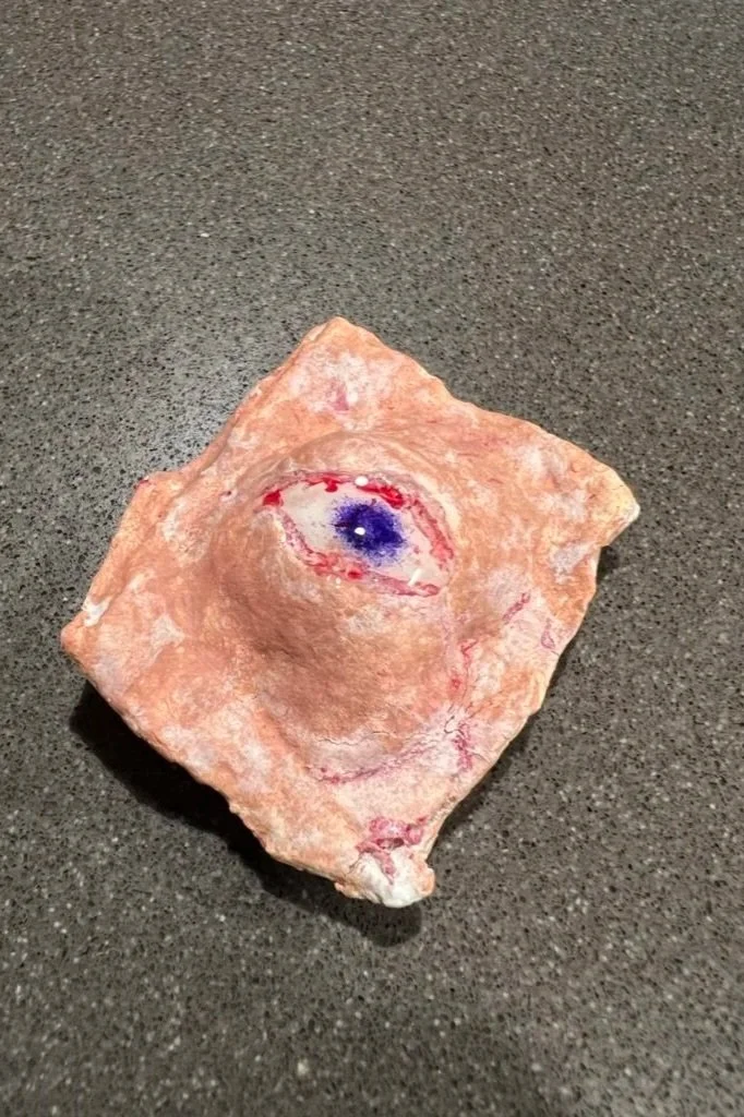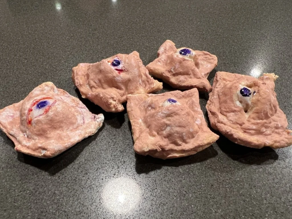 Sometimes I don’t know where my process or day will take me. I love rummaging through the recycle bin, hall closet, junk drawer, and pantry for inspiration. I crafted these ravioli-inspired pieces out of flour and water. I sculpted each one by hand, baked them until hardened, painted them with acrylic paint, and finished them with a high gloss varnish to achieve a realistic look. They’re weird, a little creepy, and kind of funny all at once, which is exactly what I wanted.