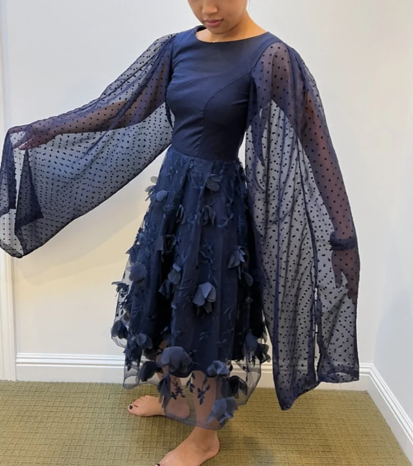 The only way to have truly unique clothing is to make it. Blue Dress is a semi-custom dress that I made to wear for a special occasion. I started with an inexpensive store-bought dress as the base, and then I pleated and layered some floral embellished tulle fabric over the original one to add texture and volume. Lastly, I added long, elegant, stylized sleeves to create extra movement and flow. What began as an ordinary blue dress finished as a extraordinary dress, totally unique to me.